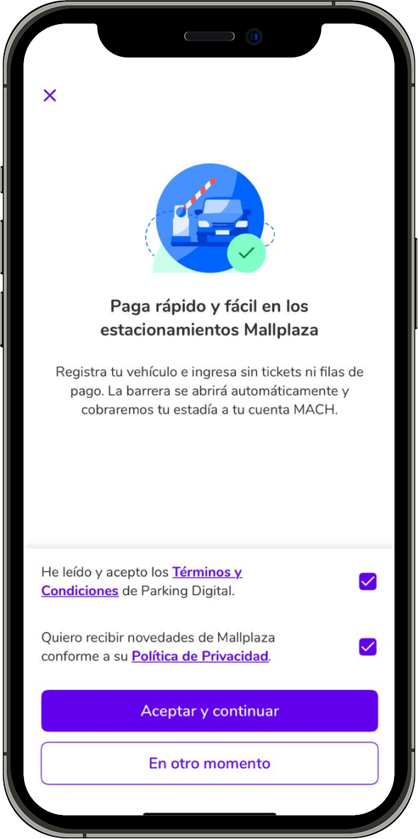 Activa Parking Digital en tu app, enrola tu patente y paga el estacionamiento sin tickets ni filas. El sistema leerá tu patente automáticamente las barreras al entrar y salir de Mallplaza.