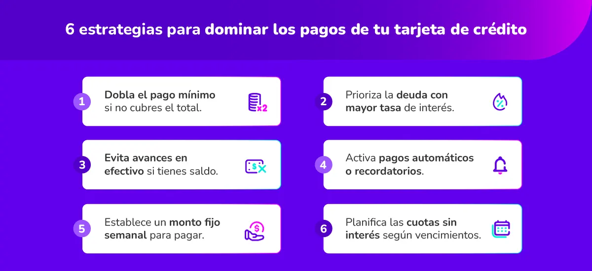 Antes de ir a las tácticas, ubícate en tu ciclo de facturación: revisa tu estado de cuenta, identifica el monto mínimo para pagar con tarjeta de crédito y define cuánto puedes abonar por sobre el pago mínimo. Con eso claro, aplica estas estrategias:
